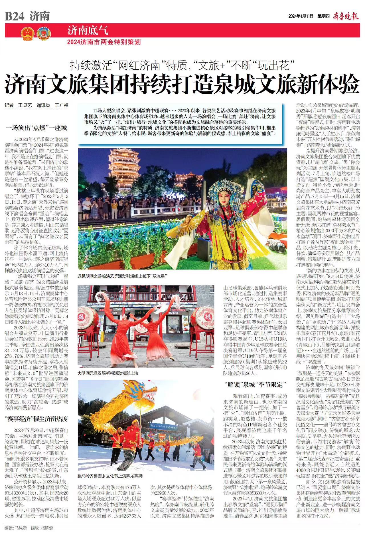 2024年1月11日,《齊魯晚報》兩會特刊刊發(fā)《持續(xù)激活“網(wǎng)紅濟南”特質(zhì),“文旅+”不斷“玩出花”——濟南文旅集團持續(xù)打造泉城文旅新體驗》的文章,采寫記者為王貝藝。文章寫到,為持續(xù)激活“網(wǎng)紅濟南”的特質(zhì),濟南文旅集團不斷推進核心景區(qū)對游客的吸引聚集作用,推出季節(jié)限定的文旅“大餐”,給市民、游客帶來更新奇的體驗與滿滿的儀式感,奉上精彩的文旅“盛宴”。如下為稿件詳情——