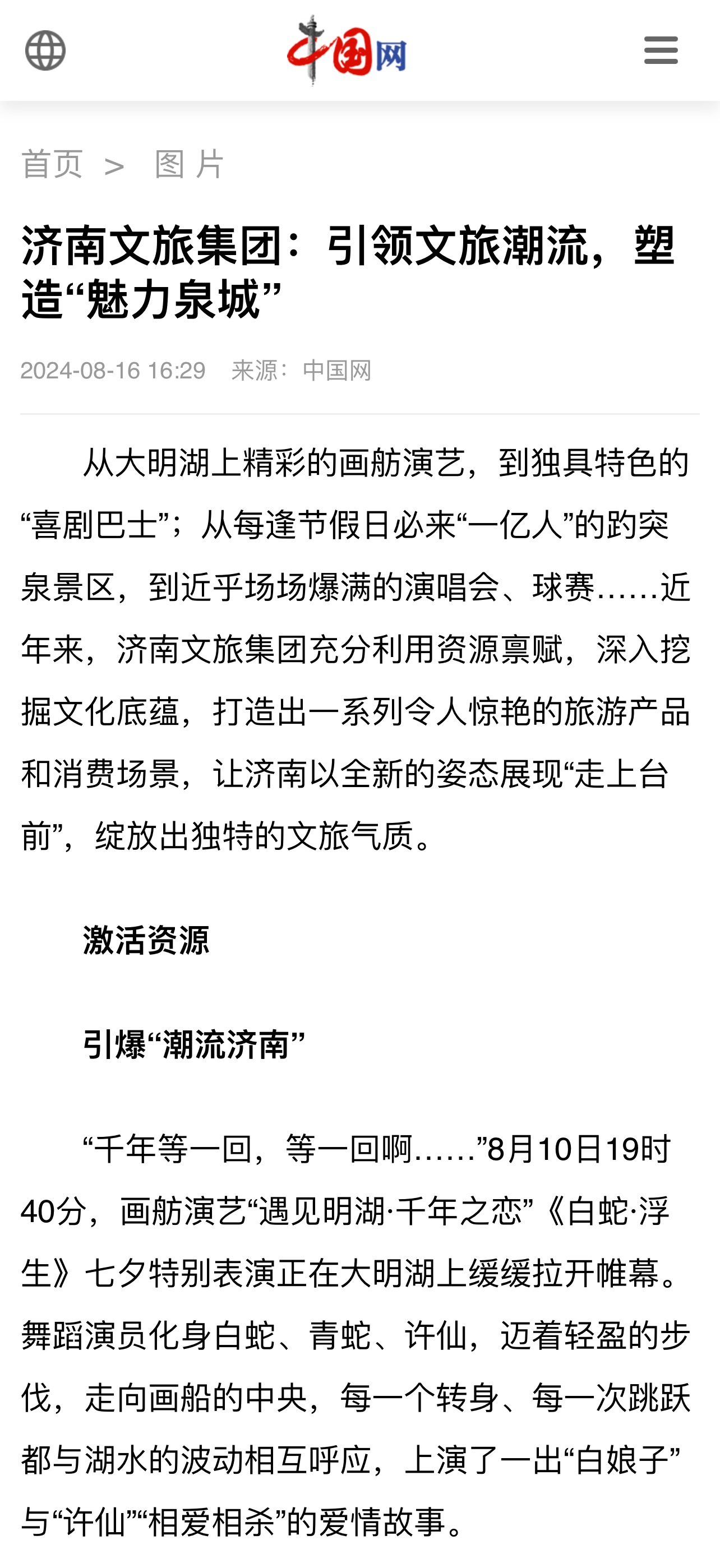 近日,《中國網(wǎng)》聚焦?jié)衔穆眉瘓F,以《濟南文旅集團:引領(lǐng)文旅潮流 塑造“魅力泉城”》為題,對集團挖掘文化底蘊,打造出一系列旅游產(chǎn)品和消費場景的經(jīng)驗做法予以宣傳報道,人民日報社中國經(jīng)濟周刊官網(wǎng)等媒體紛紛轉(zhuǎn)載。文章寫到:近年來,濟南文旅集團充分利用資源稟賦,深入挖掘文化底蘊,打造出一系列令人驚艷的旅游產(chǎn)品和消費場景,讓濟南以全新的姿態(tài)展現(xiàn)“走上臺前”,綻放出獨特的文旅氣質(zhì)。如下為稿件詳情——