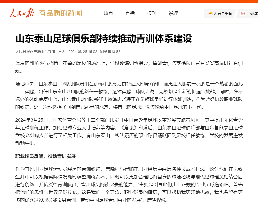 近日,人民日?qǐng)?bào)客戶端山東頻道聚焦山東泰山足球俱樂部青訓(xùn)體系建設(shè),以《山東泰山足球俱樂部持續(xù)推動(dòng)青訓(xùn)體系建設(shè)》為題,對(duì)山東泰山足球俱樂部與山東魯能泰山足球?qū)W校持續(xù)實(shí)施“高度一體化戰(zhàn)略”,打造高質(zhì)量教練員梯隊(duì)人才培養(yǎng)閉環(huán)的經(jīng)驗(yàn)做法予以宣傳報(bào)道。如下為稿件詳情——