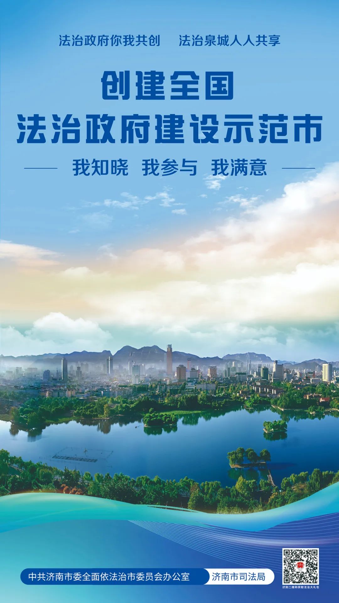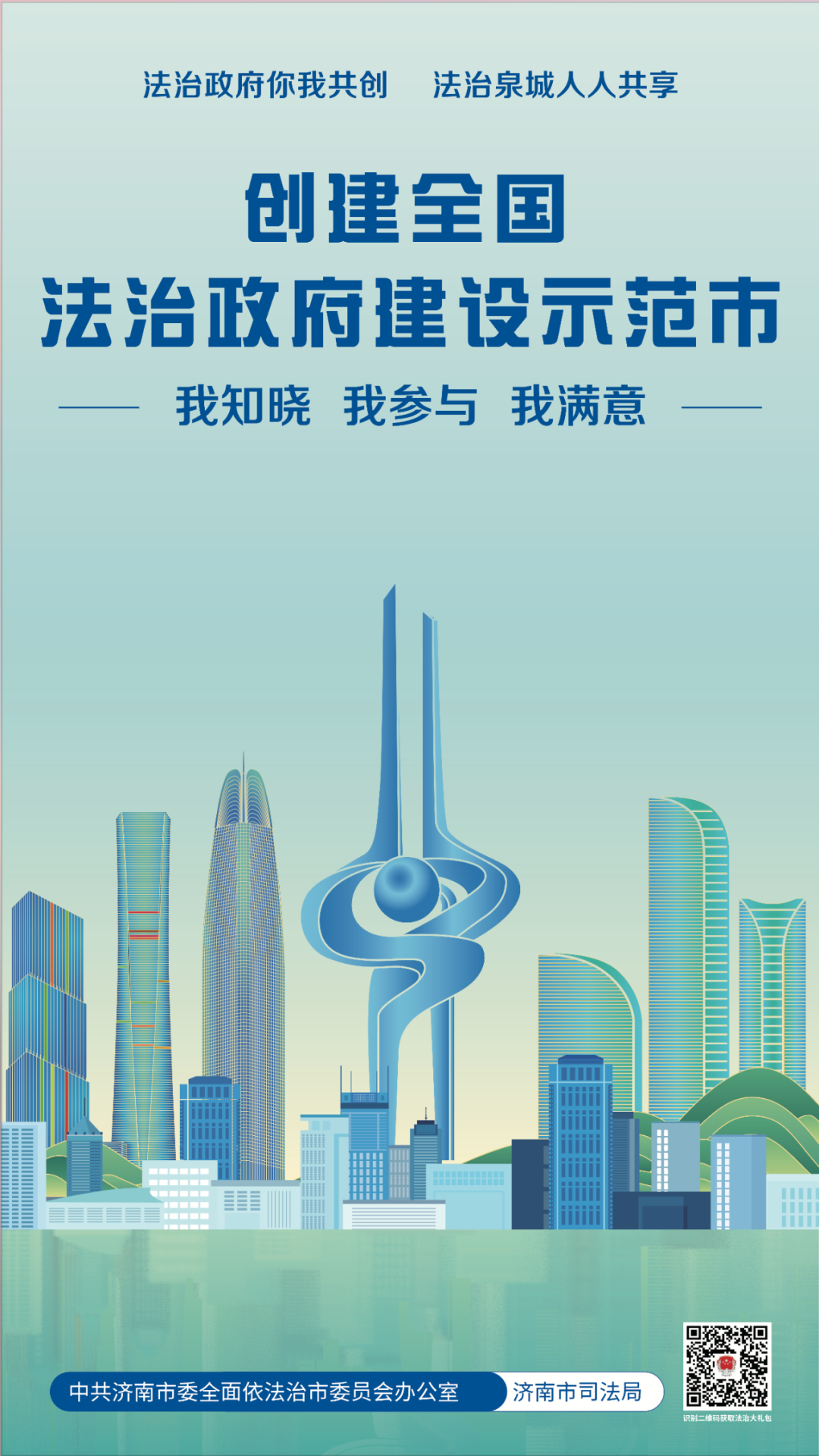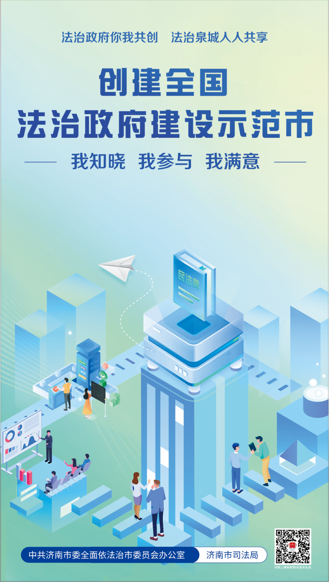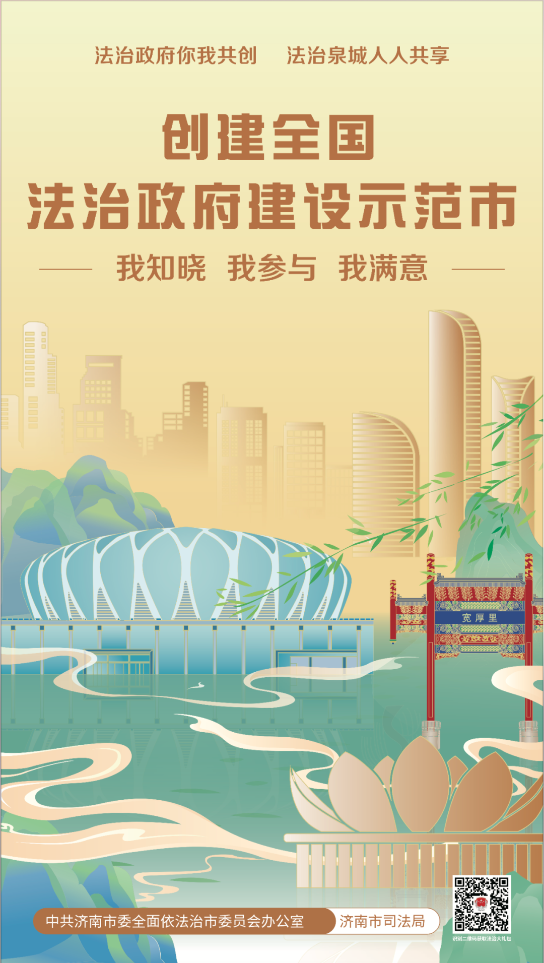 歡迎您掃描海報右下角二維碼,獲取“法治為民大禮包”,我們竭誠為您提供律師、公證、司法鑒定、法律援助、12348公共法律服熱線等優(yōu)惠措施,以及“泉城法治營商環(huán)境服務(wù)指南”等法治惠企政策舉措。您的參與、支持和滿意是我們不斷提升的最強動力,也是濟南市成功創(chuàng)建全國法治政府建設(shè)示范市的最大底氣。讓我們攜手同心全力爭創(chuàng)全國法治政府建設(shè)示范市,為加快建設(shè)“強新優(yōu)富美高”新時代社會主義現(xiàn)代化強省會貢獻法治力量!