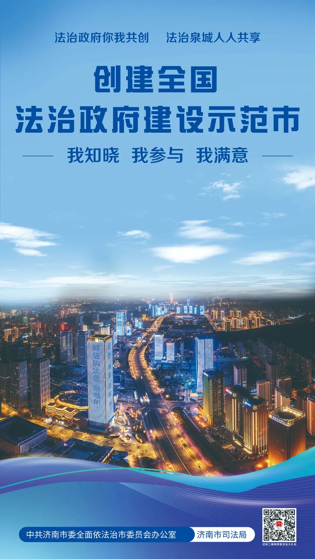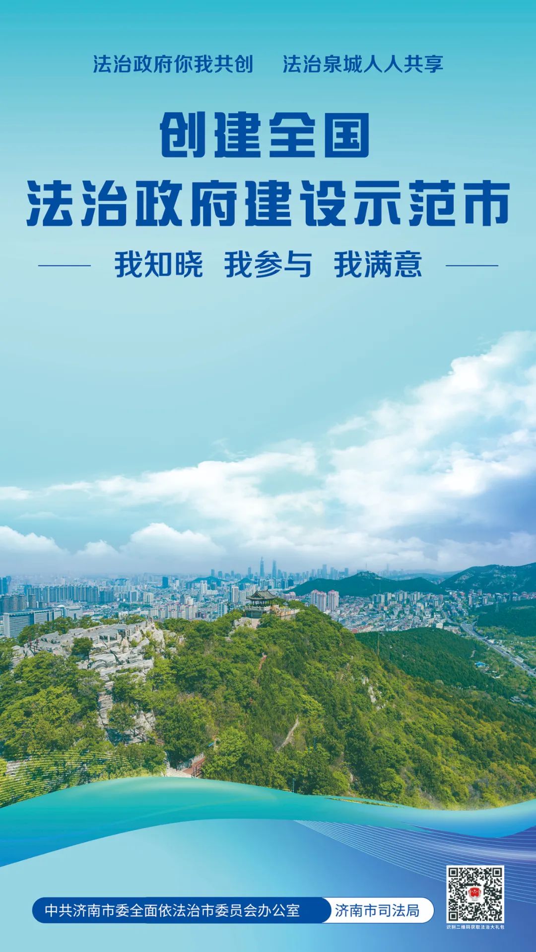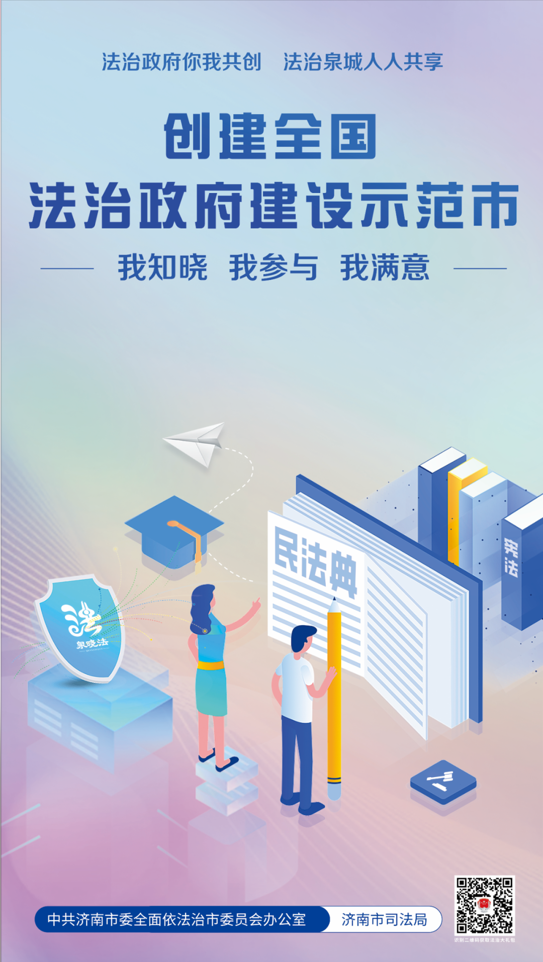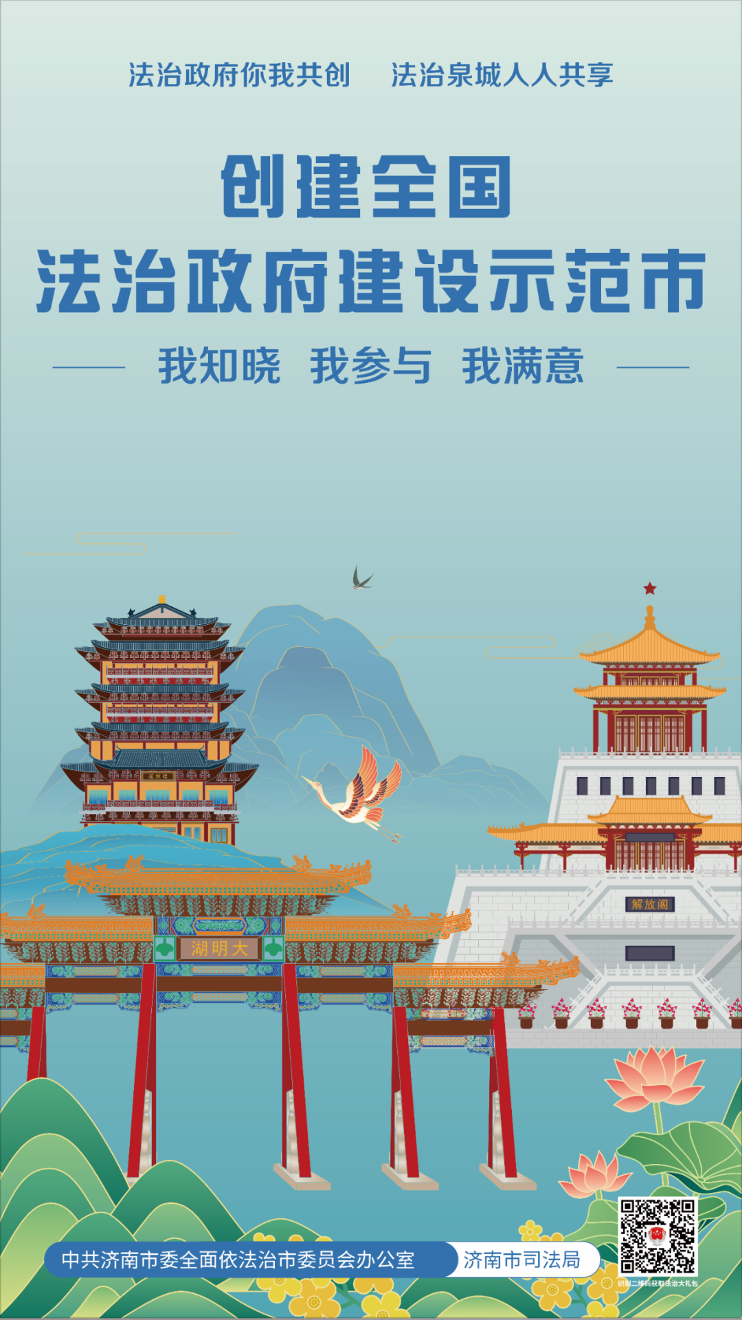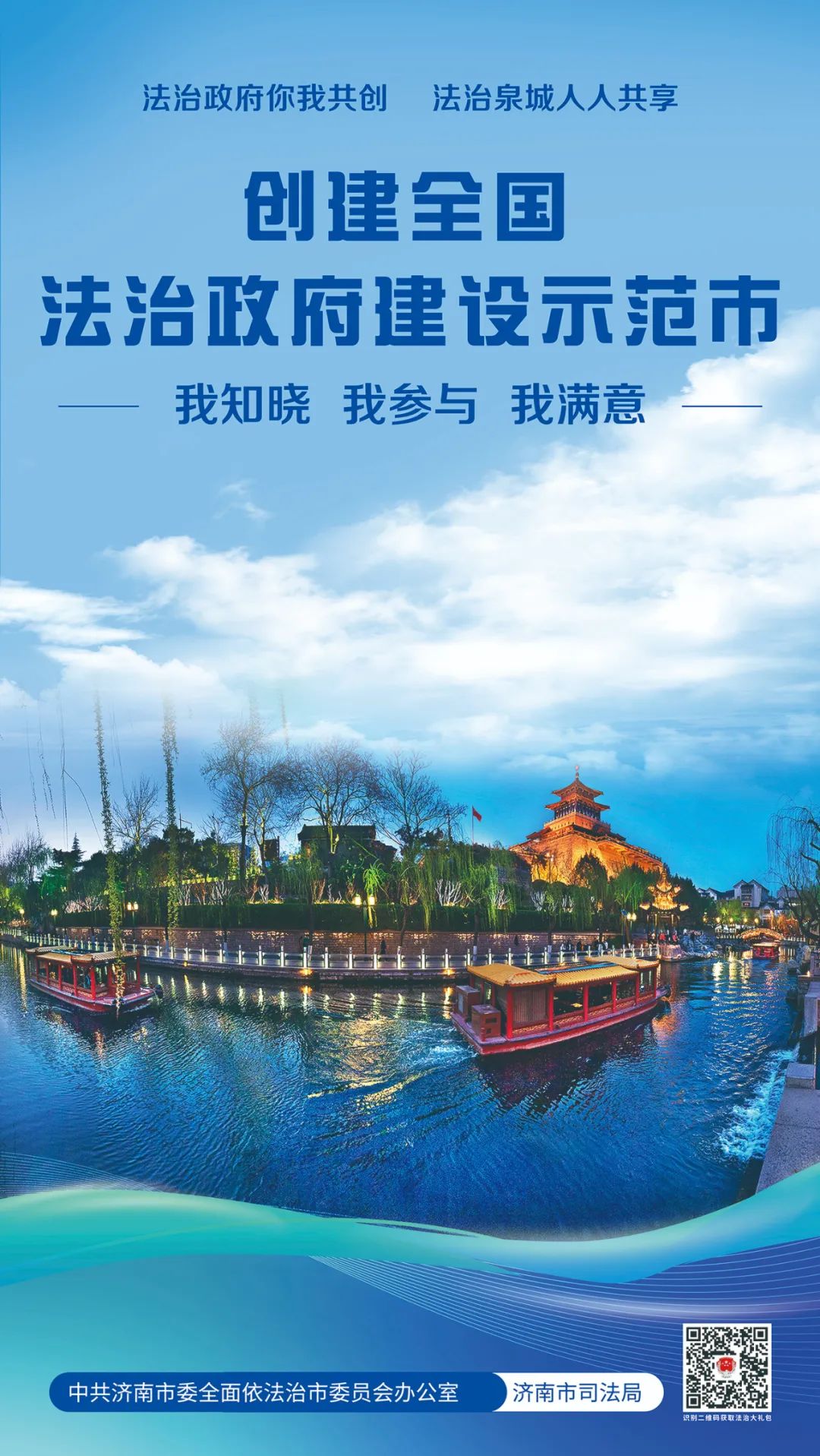 歡迎您掃描海報右下角二維碼,獲取“法治為民大禮包”,我們竭誠為您提供律師、公證、司法鑒定、法律援助、12348公共法律服熱線等優(yōu)惠措施,以及“泉城法治營商環(huán)境服務(wù)指南”等法治惠企政策舉措。您的參與、支持和滿意是我們不斷提升的最強動力,也是濟南市成功創(chuàng)建全國法治政府建設(shè)示范市的最大底氣。讓我們攜手同心全力爭創(chuàng)全國法治政府建設(shè)示范市,為加快建設(shè)“強新優(yōu)富美高”新時代社會主義現(xiàn)代化強省會貢獻法治力量!