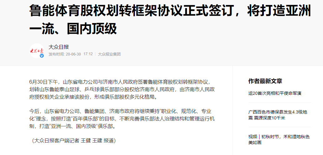 6月30日下午,山東省電力公司與濟(jì)南市人民政府簽署魯能體育股權(quán)劃轉(zhuǎn)框架協(xié)議,劃轉(zhuǎn)山東魯能泰山足球、乒乓球俱樂部部分股權(quán)給濟(jì)南市人民政府,由濟(jì)南市人民政府授權(quán)相關(guān)企業(yè)承接該股份,形成俱樂部股權(quán)多元化格局。今后,山東省電力公司、魯能集團(tuán)、濟(jì)南市政府將繼續(xù)秉持“職業(yè)化、規(guī)范化、專業(yè)化”理念,按照打造“百年俱樂部”的目標(biāo),不斷完善俱樂部法人治理結(jié)構(gòu)和管理運(yùn)行機(jī)制,打造“亞洲一流、國內(nèi)頂級(jí)”俱樂部。